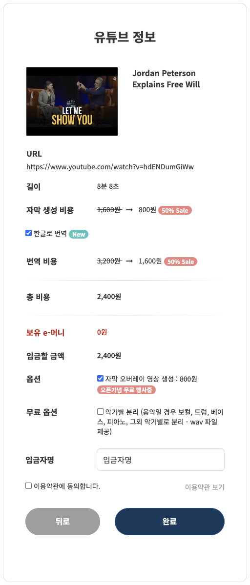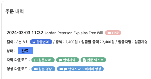- 자막 및 영상 다운로드: 입금이 확인되고 주문 상태가 "완료"로 변경되면, 생성된 자막과 자막이 오버레이된 영상을 다운로드할 수 있는 버튼이 활성화됩니다.
